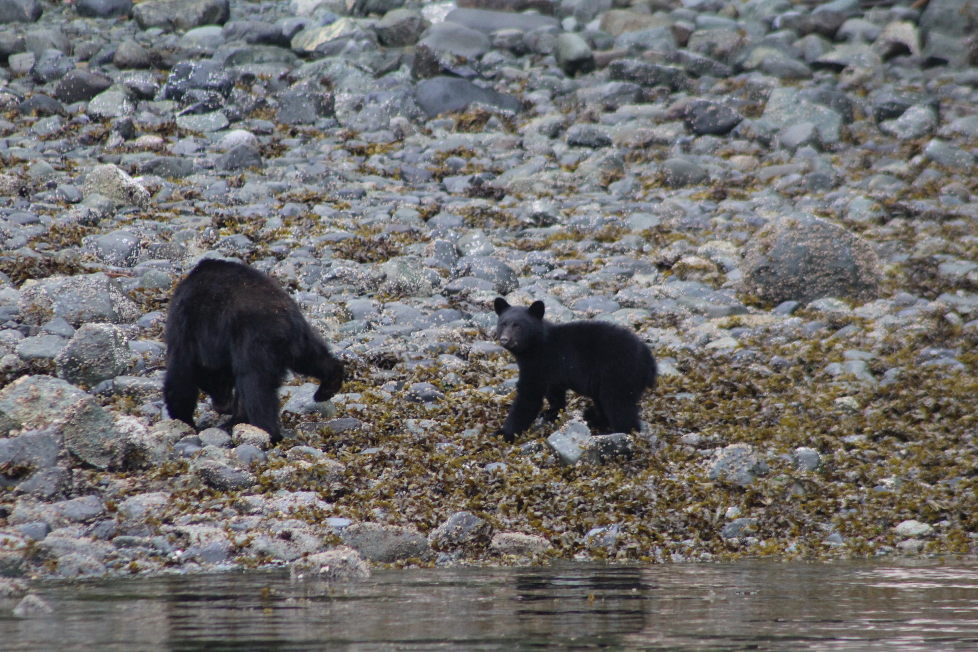 Once under way again, another unexpected sighting occurred. A female black bear and her cub were spotted by one of our guests. We quietly viewed this little family, as they turned over rocks to feed on little crabs that were well hidden. Having spent several minutes amazed at how easily mama bear could turn large boulders with a single paw, the young cub noticed our presence and decided to hide in the forest; this female Bear had taught her cub well, to maintain a good distance from humans.