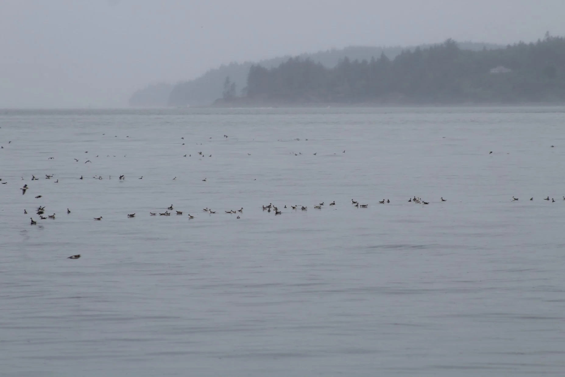 Today was also a day for the ducks, as we would say about rain weather! But familiar sayings aside, we really did have a lot of bird action, particularly around a bait ball (school of small fish, such as herring) at Bold Head. There were hundreds of Red-necked Phalaropes, and lots of Rhinoceros Auklets and Common Murres to be seen.